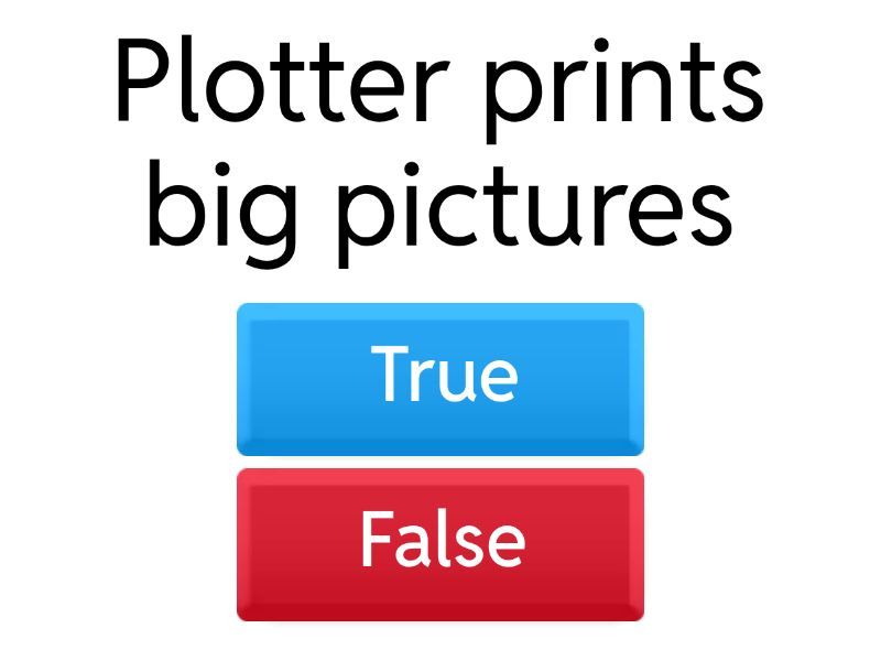 1) Plotter prints big pictures a) True b) False 2) Speaker shows videos. a) True b) False 3) Monitor is an output device. a) True b) False 4) Printer gives sound. a) True b) False 5) Plotter is used for printing big posters. a) True b) False