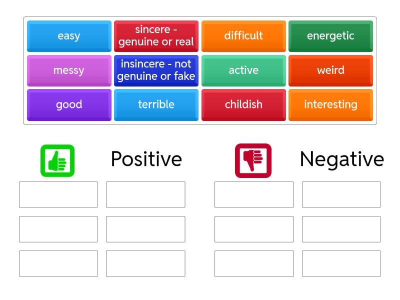Positive: sincere - genuine or real, good, interesting, active, energetic, easy, Negative: insincere - not genuine or fake, terrible, messy, difficult, weird, childish,