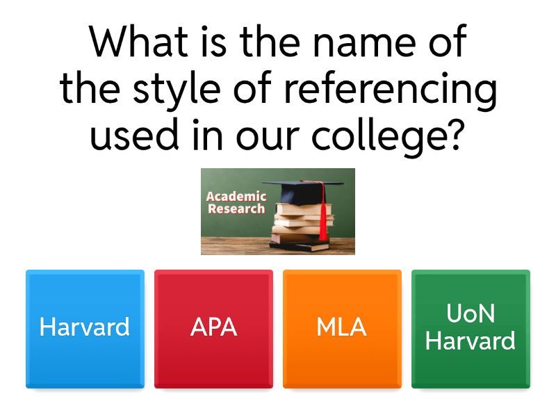 1) What is the name of the style of referencing used in our college? a) Harvard b) APA c) MLA d) UoN Harvard 2) The reference list entry begins with... a) The last name of author/ name of organisation b) the first name of author/ name or organisation 3) What kind of source reference includes a place of publication a) journal article b) book/ e book 4) What kind of reference includes page numbers a) journal article b) book 5) What should you write as name of author is the source is unknown? a) Unknown b) Anon 6) The title of the book should be in italics font a) True b) False 7) The title of the journal article should be in italics font a) True b) False 8) The reference list should not be arranged in alphabetical order a) True b) False