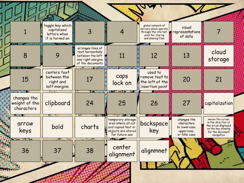 alignmnet - arranges lines of text horizontally between the left and right margins of the documents, arrow keys - moves the cursor in the direction of the arrow displayed on the key allowing for the document navigation, backspace key - used to remove text to the left of the insertion point, bold - changes the weight of the characters, capitalization - changes the characters to lowercase, uppercase, or title case, caps lock on - toggle key which capitalized letters when it is turned on, center alignment - centers text between the right and left margins, charts - visual representations of data, clipboard - temporary storage area where all cut and copied text or objects are stored for future use, cloud storage - global network of servers which operate through the internet; used for storing and sharing files, copy - makes a duplicate of the selected text and places it on the clipboard, leaving the selection in its original location, cursor - black blinking line in the document highlighting the insertion point, cut - removes the selected text from the document and places it on the clipboard, delete - key used to remove text to the right of the insertion point, desktop publishing - act of using a computer and software program to produce a professional publication containing text, images, charts, and other visual components, drawing tool - used to add, edit and apply formats to floating objects, emailing - process of sending an electronic message through the internet using an email service, enter key - moves the cursor to the next line, first line indent - indents only the first line from the left margin, floating object - object which can be positioned anywhere on the page such as word art, lines, shapes, text boxes or images,