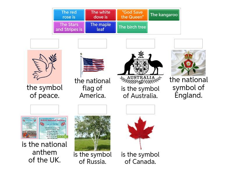 The kangaroo - is the symbol of Australia., The maple leaf - is the symbol of Canada., The birch tree - is the symbol of Russia., The white dove is - the symbol of peace., The Stars and Stripes is - the national flag of America., The red rose is - the national symbol of England., "God Save the Queen"  - is the national anthem of the UK.,
