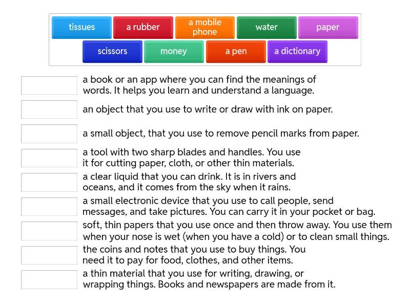 water - a clear liquid that you can drink. It is in rivers and oceans, and it comes from the sky when it rains., paper - a thin material that you use for writing, drawing, or wrapping things. Books and newspapers are made from it., a dictionary - a book or an app where you can find the meanings of words. It helps you learn and understand a language., money - the coins and notes that you use to buy things. You need it to pay for food, clothes, and other items., a mobile phone - a small electronic device that you use to call people, send messages, and take pictures. You can carry it in your pocket or bag., a pen - an object that you use to write or draw with ink on paper., scissors - a tool with two sharp blades and handles. You use it for cutting paper, cloth, or other thin materials., a rubber - a small object, that you use to remove pencil marks from paper., tissues - soft, thin papers that you use once and then throw away. You use them when your nose is wet (when you have a cold) or to clean small things.,