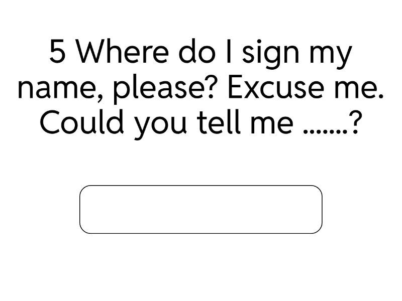 1 When is the test? Could you tell me when ....... ?, 2 What is your name? Do you mind telling....... ?, 3 How old are you? Can I ask you .......?, 4 Where do we have to go? Do you know .......?, 5 Where do I sign my name, please? Excuse me. Could you tell me .......?, 6 Please sit down over there. Would you mind .......?, 7 What is your address? Can I ask you .......?, What time is it? Do you know........ ?.