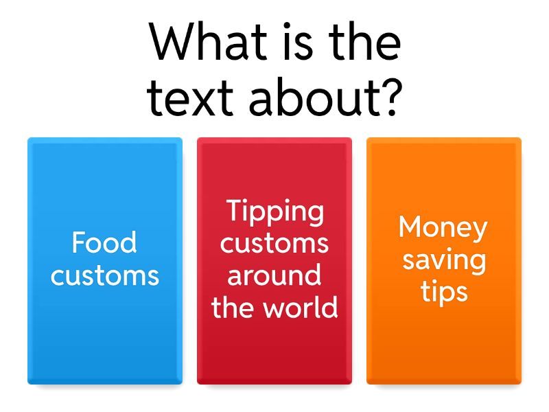 1) What is the text about? a) Food customs b) Tipping customs around the world c) Money saving tips 2) What is the writer’s main message? a) You should always give a tip everywhere b) Tipping rules are different in different countries. c) Tipping is not important. 3) In France, what is true about tipping? a) There is a 15% service charge included. b) You must always leave extra money. c) Tipping is rude. 4) In Germany, people usually give: a) No tip at all b) Only coins c) 5–10% extra for good service 5) In Australia and New Zealand, tipping is a) Not part of the culture b) ery common c) Always included in the price