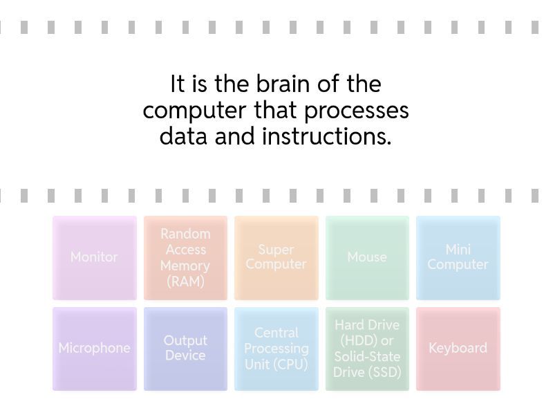 Central Processing Unit (CPU) - It is the brain of the computer that processes data and instructions., Keyboard - Which device allows the user to input text into the computer?-, Super Computer - What is the fastest and most powerful type of computer used for complex tasks like weather forecasting and stock analysis?, Hard Drive (HDD) or Solid-State Drive (SSD) - It is a storage device that permanently stores data even when the computer is off., Monitor - Which part of the computer is responsible for displaying visual output?, Output Device - Receives data from the computer and shows the result, like a monitor or printer., Mouse - This hardware component is used to point, click, and drag on-screen items. -, Random Access Memory (RAM) - It temporarily stores data that the CPU is currently using, Microphone - This device allows you to record your voice into the computer., Mini Computer - What type of computer is smaller and cheaper than mainframes, with lower speed and storage capacity?,