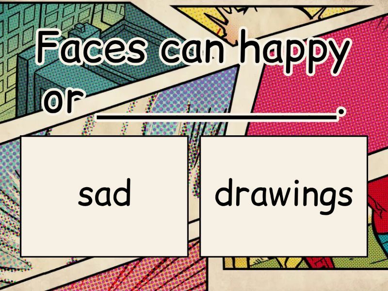 1) Faces can happy or _________. a) sad b) drawings 2) They can have green eyes or _________ eyes. a) short b) brown 3) They can have long or _________ hair. a) sad b) short 4) They can be in photos, paper collages, paintings or _________. a) drawings b) brown
