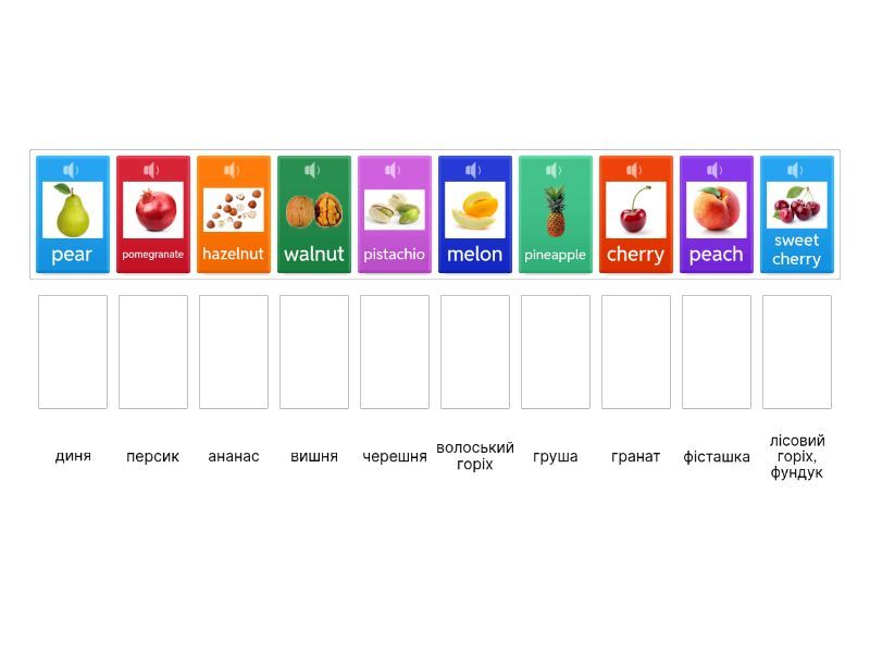 peanut - арахіс, pear - груша, orange - апельсин, pineapple - ананас, banana - банан, peach - персик, lemon - лимон, lime - лайм, apricot - абрикос, tangerine - мандарин, plum - слива, avocado - авокадо, pomegranate - гранат, strawberry - полуниця, raspberry - малина, cranberry - журавлина, grapes - виноград, watermelon - кавун, melon - диня, cherry - вишня, sweet cherry - черешня, blueberry - лохина, blackberry - ожина, currant - смородина, fig - фінік, almond - мигдаль, cashew - кеш'ю, hazelnut - лісовий горіх, фундук, pistachio - фісташка, walnut - волоський горіх,