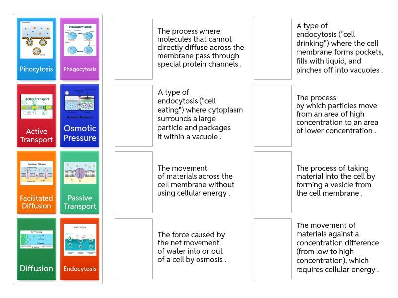 Passive Transport - The movement of materials across the cell membrane without using cellular energy ​., Diffusion - The process by which particles move from an area of high concentration to an area of lower concentration ​., Facilitated Diffusion - The process where molecules that cannot directly diffuse across the membrane pass through special protein channels ​., Aquaporins - Water channel proteins that allow water to pass through cell membranes ​., Osmosis - The diffusion of water through a selectively permeable membrane ​., Osmotic Pressure - The force caused by the net movement of water into or out of a cell by osmosis ​., Isotonic Solution - A solution where the concentration of solutes is the same as the concentration inside the cell ​., Hypertonic Solution - A solution that has a higher concentration of solutes compared to the cell ​., Hypotonic Solution - A solution that has a lower concentration of solutes compared to the cell ​., Active Transport - The movement of materials against a concentration difference (from low to high concentration), which requires cellular energy ​., Protein Pumps - Transport proteins that use energy to move small molecules and ions across the cell membrane ​., Endocytosis - The process of taking material into the cell by forming a vesicle from the cell membrane ​., Phagocytosis - A type of endocytosis ("cell eating") where cytoplasm surrounds a large particle and packages it within a vacuole ​., Pinocytosis - A type of endocytosis ("cell drinking") where the cell membrane forms pockets, fills with liquid, and pinches off into vacuoles ​., Exocytosis - The process of releasing large amounts of material from the cell by fusing a vesicle with the cell membrane ​.,
