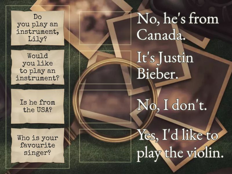 Do you play an instrument, Lily? - No, I don't., Would you like to play an instrument? - Yes, I'd like to play the violin., Who is your favourite singer? - It's Justin Bieber., Is he from the USA? - No, he's from Canada.,