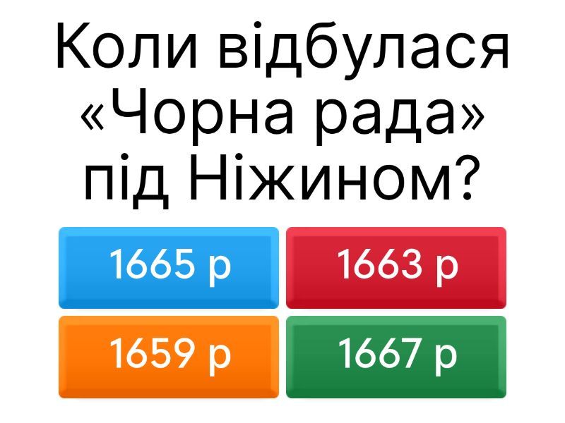 1) Коли відбулася «Чорна рада» під Ніжином? a) 1665 р b) 1663 р c) 1659 р d) 1667 р 2) Хто був обраний гетьманом Лівобережної України на «Чорній раді»? a) Іван Брюховецький b) Павло Тетеря c) Іван Виговський d) Юрій Хмельницький 3) Хто очолив Правобережну Україну після зречення Юрія Хмельницького? a) Петро Дорошенко b) Іван Брюховецький c) Дем’ян Многогрішний d) Павло Тетеря 4) Які сили підтримували Павла Тетерю під час його правління? a) Московські воєводи b) Польські війська і кримські татари c) Турецькі яничари d) Запорозьке військо 5) Хто підняв повстання проти Павла Тетері? a) Іван Сірко b) Іван Богун c) Петро Дорошенко d) Остап Гоголь 6) Які угоди уклав Іван Брюховецький із Московією у 1665 р.? a) Московські статті b) Березневі статті c) Андрусівське перемир’я d) Гадяцька угода 7) Який наслідок мали Московські статті 1665 р.? a) Вони проголосили незалежність України b) Вони значно обмежили автономію Гетьманщини c) Вони встановили союз з Польщею d) Вони укріпили владу гетьмана 8) Коли було укладене Андрусівське перемир’я? a) 1667 р b) 1654 р. c) 1672 р d) 1663 р 9) Які землі залишалися під владою Московії за Андрусівським перемир’ям? a) Правобережжя b) Уся Україна c) Поділля d) Лівобережна Україна 10) Яке значення мало Андрусівське перемир’я для України? a) Відновлення єдності козацької держави b) Утворення трьох частин України c) Остаточний поділ українських земель між Московією та Польщею d) Звільнення України від іноземного панування
