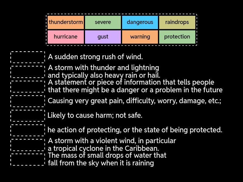 protection - he action of protecting, or the state of being protected., gust - A sudden strong rush of wind., hurricane - A storm with a violent wind, in particular a tropical cyclone in the Caribbean., raindrops - The mass of small drops of water that fall from the sky when it is raining, thunderstorm - A storm with thunder and lightning and typically also heavy rain or hail., warning - A statement or piece of information that tells people that there might be a danger or a problem in the future, severe - Causing very great pain, difficulty, worry, damage, etc.;, dangerous - Likely to cause harm; not safe.,
