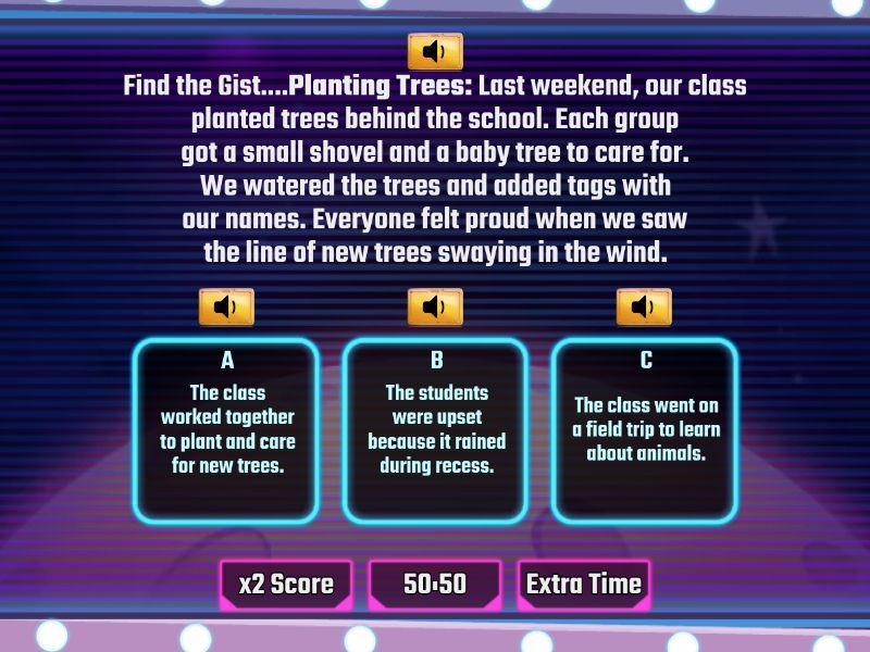 1) Find the Gist....Planting Trees: Last weekend, our class planted trees behind the school. Each group got a small shovel and a baby tree to care for. We watered the trees and added tags with our names. Everyone felt proud when we saw the line of new trees swaying in the wind. a) The class worked together to plant and care for new trees. b) The students were upset because it rained during recess. c) The class went on a field trip to learn about animals. 2) Find the Gist.... Dogs as Pets: Dogs are friendly animals. They love to play and go for walks. Many people have dogs as pets because they are loyal and fun to be around. Dogs make great friends for families. a) Dogs are friendly pets that make great companions. b) Dogs are hard to take care of and don’t like people. c) Dogs live in the forest and hunt for food. 3) Find the Gist.... Why Reading Is Fun: I think reading is one of the best things to do. When I read, I can visit new worlds in my mind. Reading helps you learn new words and ideas. Everyone should read a little every day.Find the Gist....Find the Gist....Find the Gist.... a) Reading is fun because it helps you learn and imagine new things. b) Reading is boring and only teaches about schoolwork. c) Reading is only for when you have nothing else to do. 4) Find the Gist.... School Lunch Should Be Longer: I think our school lunch time should be longer. Sometimes lunch ends before I finish my food. We need time to eat and talk with our friends. If we had more time, everyone would feel better. a) Students need more time for lunch to eat and talk with friends. b) Students don’t like to eat lunch at school. c) Lunch should be shorter so students can go to recess sooner. 5) Find the Gist.... The Stormy Night: I heard thunder boom loudly outside my window. The lights flickered and then went out. I grabbed my flashlight and sat next to my sister. When the storm was over, we laughed and felt safe. a) A storm scared the children, but they stayed safe together. b) The children played outside during a sunny day. c) They watched a movie and fell asleep on the couch. 6) Find the Gist.... A Day at the Beach: The sun was bright, and the air smelled like salt. My sister and I built a big sandcastle near the water. After lunch, we collected shells and watched the waves. It was one of the best days of my summer vacation. a) A family had a fun day building sandcastles and enjoying the beach. b) The family got stuck in a rainstorm at the beach. c) They went to the mountains and climbed rocks. 7) 🐾 7. Helping the Lost Puppy: One afternoon, I found a small puppy near the park. We gave it some water and looked for its owner. A girl from my class ran up and shouted, “That’s my dog!” She thanked me and said the puppy had run away that morning. a) The writer helped return a lost puppy to its owner. b) The writer adopted a new puppy from a shelter. c) The writer took the puppy home to keep forever.