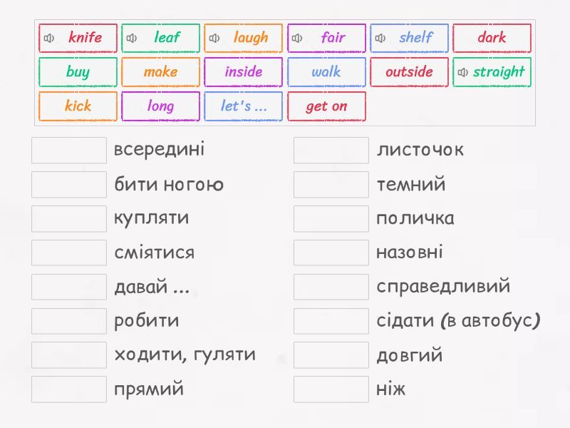 shelf - поличка, make - робити, dark - темний, straight - прямий, fair - справедливий, long - довгий, knife - ніж, inside - всередині, outside - назовні, walk - ходити, гуляти, laugh - сміятися, kick - бити ногою, get on  - сідати (в автобус), buy - купляти, leaf - листочок, let's ... - давай ...,