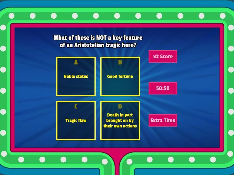 1) What of these is NOT a key feature of an Aristotelian tragic hero? a) Noble status b) Good fortune c) Tragic flaw d) Death in part brought on by their own actions 2) What characterised Senecan tragedy? a) Light tone b) Roman setting c) Happy ending d) Violence and revenge 3) Which play had popularised revenge tragedy in Elizabethan England? a) Tournier's The Revenger's Tragedy b) Shakespeare's Othello c) Webster's The Duchess of Malfi d) Kyd's The Spanish Tragedy 4) Which Italian writer promoted the use of spying and backstabbing at court? a) Dante Alighieri b) Niccolò Machiavelli c) Giovanni Boccaccio d) Francesco Petrarch 5) How could James I of England / VI of Scotland be seen as a model for Hamlet? a) His father colluded with, and married, his mother's murderer b) He was incredibly misogynistic c) His mother colluded with, and married, his father's murderer d) He was a possible successor for the throne 6) How was a widow supposed to behave in Shakespeare’s time? a) Remarry quickly and forget the late husband b) Remain chaste and mourn for a suitable period of time c) Go to a nunnery d) Travel abroad 7) Why was marriage between a woman and her brother-in-law considered incestuous? a) It was banned by the book of Deuteronomy in the Bible b) It was considered kind of gross c) It was considered a betrayal of the first brother d) It was banned by the book of Leviticus 8) What possible reason does Horatio give for the appearance of the ghost? a) A supernatural warning of a Norwegian invasion b) A mass hallucination brought on by too much revelling c) A supernatural warning about Julius Caesar d) A Halloween prank performed by Francisco after he goes off stage 9) What might a Catholic member of the audience believe about Old Hamlet’s ghost?  a) It is a spirit of the dead requesting prayers to be said for it b) It is a devilish illusion sent to tempt an innocent to commit an evil act c) It is a trick of the mind d) It is a spirit of the dead returned from Purgatory to demand revenge so that it may move on 10) What other strange things have been happening in Denmark, similar to the events preceding Julius Caesar’s death? a) Political unrest, such as revolts and executions b) Unnatural omens such as eclipses and comets c) Economic decline brought on by a stock market crash d) Natural disasters, such as earthquakes and typhoons