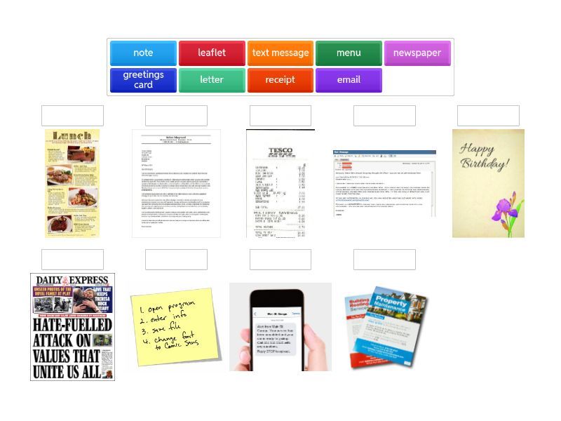 leaflet, email, letter, menu, note, receipt, newspaper, greetings card, text message,