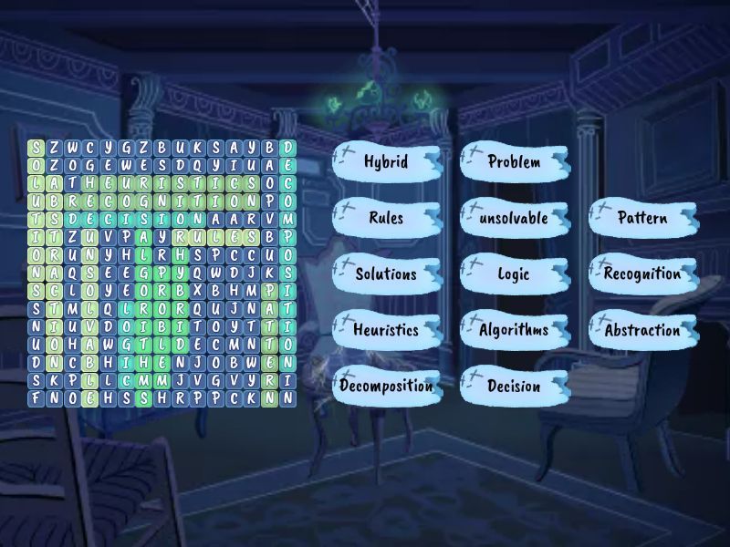 Abstraction - Abstraction, Decomposition - Decomposition, Pattern - Pattern, Problem - Problem, Rules - Rules, Decision - Decision, Heuristics - Heuristics, Algorithms - Algorithms, Solutions - Solutions, Logic - Logic, Recognition - Recognition, Hybrid - Hybrid, Unsolvable - unsolvable,