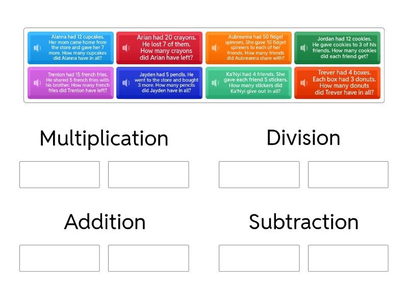 Multiplication: Ka'Nyi had 4 friends. She gave each friend 5 stickers. How many stickers did Ka'Nyi give out in all?, Trever had 4 boxes. Each box had 3 donuts. How many donuts did Trever have in all?, Division: Jordan had 12 cookies. He gave cookies to 3 of his friends. How many cookies did each friend get?, Aubreanna had 50 fidget spinners. She gave 10 fidget spinners to each of her friends. How many friends did Aubreanna share with?, Addition: Jayden had 5 pencils. He went to the store and bought 3 more. How many pencils did Jayden have in all?, Alanna had 12 cupcakes. Her mom came home from the store and gave her 7 more. How many cupcakes did Alanna have in all?, Subtraction: Trenton had 15 french fries. He shared 5 french fries with his brother. How many french fries did Trenton have left?, Arian had 20 crayons. He lost 7 of them. How many crayons did Arian have left?,