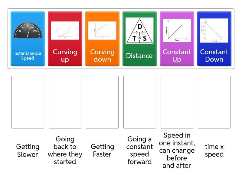 Curving up - Getting Faster, Curving down - Getting Slower, Flat Line - Stopped and Not Moving, Constant Down - Going back to where they started, Constant Up - Going a constant speed forward, Constant Speed - Same speed the whole way, Instantaneous Speed - Speed in one instant, can change before and after, Velocity - Speed + Direction, Acceleration - Change in speed, change in direction, or change in both, Distance - time x speed, Time - distance ÷ speed, Speed - distance ÷ time,