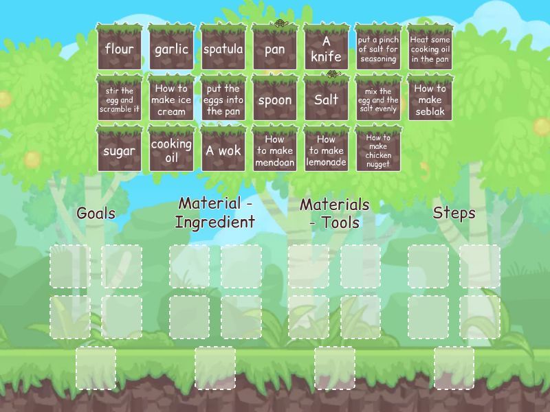 Goals: How to make ice cream, How to make seblak, How to make lemonade , How to make chicken nugget, How to make mendoan, Material - Ingredient : sugar, Salt, cooking oil, flour, garlic , Materials - Tools: A wok, A knife , spoon, pan, spatula, Steps : Heat some cooking oil in the pan, put the eggs into the pan , stir the egg and scramble it, put a pinch of salt for seasoning, mix the egg and the salt evenly,