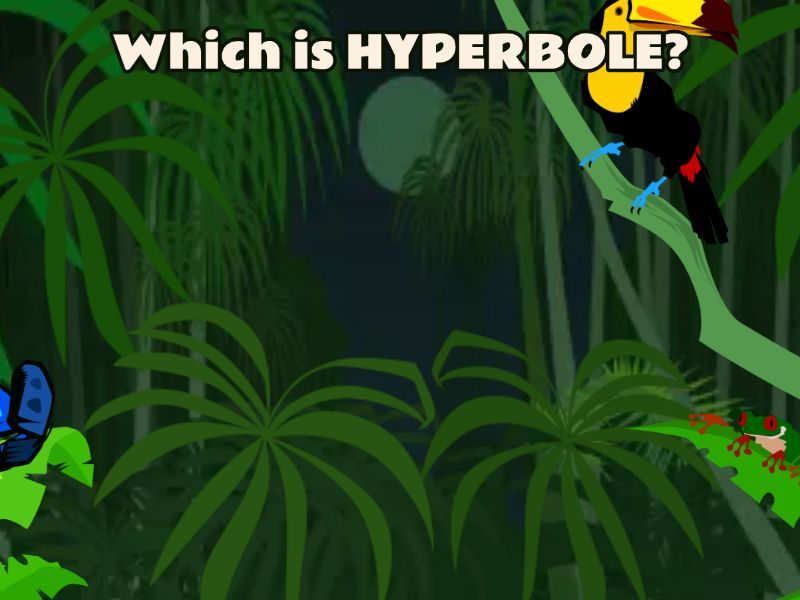1) Which is a SIMILE? a) The player is as fast as a cheetah. b) The player is a cheetah. c) Players playing with pucks. 2) Which is a METAPHOR? a) Olivia is a bear in the morning. b) Olivia is as grumpy as a bear in the morning. c) Bears are huge! 3) Which is ALLITERATION? a) My pet monkey makes meatballs. b) My pet monkey is as fast as a cheetah. c) Mondays are like Tuesdays. 4) Which is ONOMATOPOEIA?  a) The car zoomed around the track. b) The car drove around the track. c) Dog d) Cat 5) Which is an IDIOM? a) It's raining very hard. b) Break a leg! 6) Which is HYPERBOLE? a) We beat them by a million touchdowns. b) We beat the other team. 7) Which is PERSONIFICATION? a) The flowers danced in the wind. b) The sun is bright. 8) Which is a SIMILE? a) Her eyes sparkled like the stars.. b) Her eyes are big. c) She is nice. 9) Which is a METAPHOR? a) My computer is a dinosaur. b) My computer is as old as a dinosaur. 10) Which is ONOMATOPOEIA? a) Buzz! b) Car c) Bee 11) Which is PERSONIFICATION? a) The volcano slept for many years. b) There was an earthquake in California. 12) Which is HYPERBOLE? a) I am so hungry I could eat a horse! b) I ate two plates of food.
