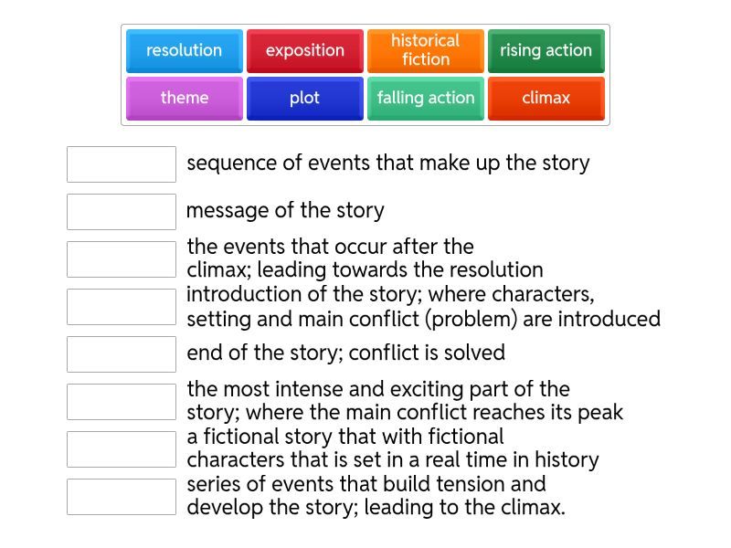 theme - message of the story , exposition - introduction of the story; where characters, setting and main conflict (problem) are introduced , plot - sequence of events that make up the story , rising action - series of events that build tension and develop the story; leading to the climax. , climax - the most intense and exciting part of the story; where the main conflict reaches its peak , falling action - the events that occur after the climax; leading towards the resolution , resolution - end of the story; conflict is solved, historical fiction - a fictional story that with fictional characters that is set in a real time in history ,