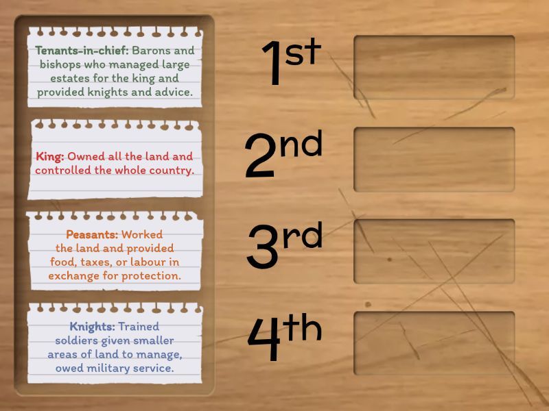 King: Owned all the land and controlled the whole country., Tenants-in-chief: Barons and bishops who managed large estates for the king and provided knights and advice., Knights: Trained soldiers given smaller areas of land to manage, owed military service., Peasants: Worked the land and provided food, taxes, or labour in exchange for protection..