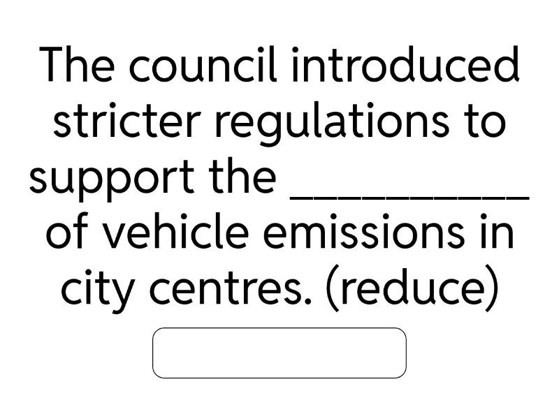 The professor delivered a lecture on the __________ of cultural heritage sites located in conflict zones. (protect), The student’s essay lacked logical __________, which significantly undermined its clarity. (organise), The council introduced stricter regulations to support the __________ of vehicle emissions in city centres. (reduce), The court concluded that the contract’s terms had led to the unfair __________ of one of the parties involved. (treat), The museum received a generous grant to support the __________ of deteriorating medieval manuscripts. (preserve), Further __________ of the data was required before any conclusions could be drawn. (analyse), Effective __________ of resources is essential for improving productivity in large organisations. (manage), The report highlighted the growing __________ of global markets and its impact on national economic policies. (integrate).