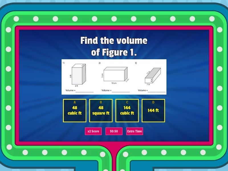 1) Find the volume of Figure 1. a) 48 cubic ft b) 48 square ft c) 144 cubic ft d) 144 ft 2) Find the volume of Figure 2.  a) 100 cubic ft b) 100 c) 50 d) 50 cubic ft 3) Find the volume of Figure 2. a) 105 cubic ft b) 100 cubic ft c) 28 cubic ft d) 26 cubic ft 4) What is the volume of the figure? a) 120 cubic in b) 120 c) 40 cubic in d) 40 5) If a cube as a side length of 2. What's its volume? a) 2 cubic units b) 4 cubic units c) 6 cubic units d) 8 cubic units 6) A cube has a side length of 3. What's its volume? a) 3 cubic units b) 6 cubic units c) 9 cubic units d) 27 cubic units