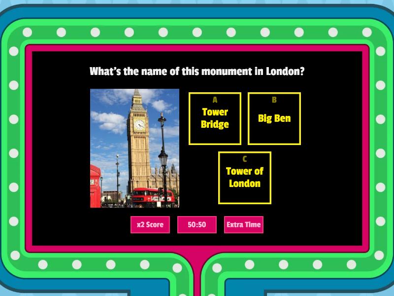 1) What's the name of this monument in London? a) Tower Bridge b) Big Ben c) Tower of London 2) What's the name of this? a) Big Ben b) Tower of London c) London Eye 3) And the name of this square? a) Big Ben Square b) London Eye c) Trafalgar Square 4) What's the name of this place? a) Hyde Park b) Tower Bridge c) London Zoo 5) The name of this is... a) Tower of London b) Buckingham Palace c) Hyde Park 6) When did the royal family start living at Buckingham palace? a) 1837 b) 1992 c) 1351 7) What's the name of this monument? a) Tower of London b) Tower Bridge c) Tower Tower 8) Who's statue is this? a) Boris Johnson b) David Beckham c) Horatio Nelson 9) Who is the head of the army in the UK? a) The Prime Minister (Boris Johnson) b) The Queen c) The minister of defence 10) How many types of fish live in the Thames? a) 1 b) 3000 c) 125
