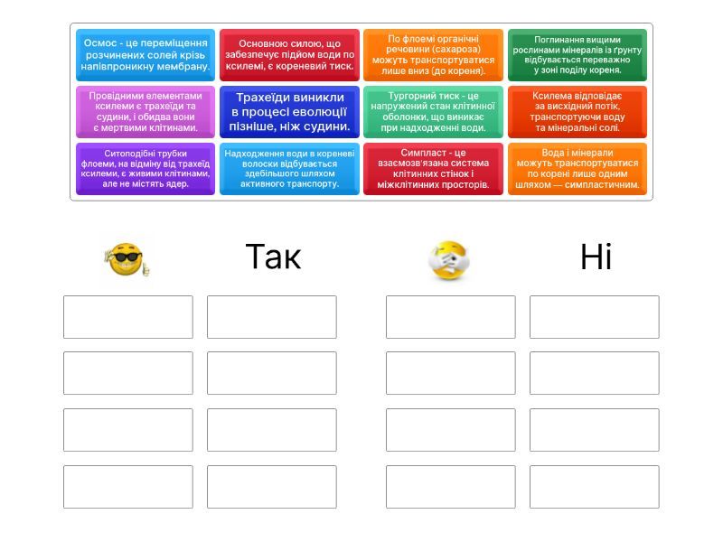Так: Тургорний тиск - це напружений стан клітинної оболонки, що виникає при надходженні води., Ксилема відповідає за висхідний потік, транспортуючи воду та мінеральні солі., Провідними елементами ксилеми є трахеїди та судини, і обидва вони є мертвими клітинами., Ситоподібні трубки флоеми, на відміну від трахеїд ксилеми, є живими клітинами, але не містять ядер., Ні: Поглинання вищими рослинами мінералів із ґрунту відбувається переважно у зоні поділу кореня., Надходження води в кореневі волоски відбувається здебільшого шляхом активного транспорту., Осмос - це переміщення розчинених солей крізь напівпроникну мембрану., Вода і мінерали можуть транспортуватися по корені лише одним шляхом — симпластичним., Симпласт - це взаємозв’язана система клітинних стінок і міжклітинних просторів., Основною силою, що забезпечує підйом води по ксилемі, є кореневий тиск., По флоемі органічні речовини (сахароза) можуть транспортуватися лише вниз (до кореня)., Трахеїди виникли в процесі еволюції пізніше, ніж судини.,