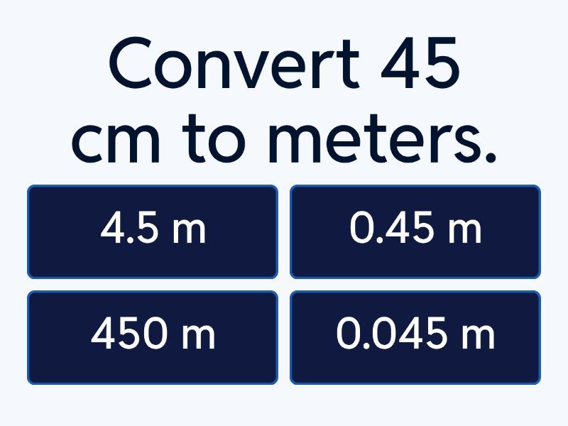 1) Convert 45 cm to meters. a) 4.5 m b) 0.45 m c) 450 m d) 0.045 m 2) How many grams are in 3 kg? a) 300 g b) 30 g c) 3000 g d) 30000 g 3) Convert 5 L to millilitres. a) 5000 ml b) 500 ml c) 50 ml d) 50000 ml 4) Convert 2000 pence to pounds. a) £2.00 b) £0.20 c) £200.00 d) £20.00 5) Convert 2.5 hours to minutes. a) 180 min b) 250 min c) 125 min d) 150 min 6) Convert 0.75 m to centimeters. a) 750 cm b) 7.5 cm c) 75 cm d) 0.075 cm 7) How many kilograms are in 4500 grams? a) 4.5 kg b) 45 kg c) 0.45 kg d) 450 kg 8) Convert 7.5 L to millilitres. a) 750 ml b) 75000 ml c) 75 ml d) 7500 ml 9) Convert 3600 pence to pounds. a) £3.60 b) £36.00 c) £360.00 d) £0.36 10) Convert 0.25 hours to minutes. a) 25 min b) 15 min c) 2.5 min d) 250 min