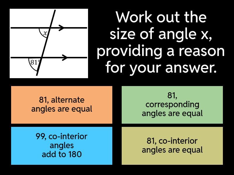 1) Work out the size of angle x, providing a reason for your answer. a) 81, alternate angles are equal b) 81, corresponding angles are equal c) 99, co-interior angles add to 180 d) 81, co-interior angles are equal 2) Find the size of angle y, giving a reason for your answer. a) 70, alternate angles are equal b) 70, corresponding angles are equal c) 110, co-interior angles add to 180 d) 70, co-interior angles are equal 3) Find the size of angle x, giving a reason for your answer. a) 55, corresponding angles are equal b) 55, alternate angles are equal c) 55, co-interior angles are equal d) 125, co-interior angles add to 180 4) Find the size of angle p. a) 55 b) 135 c) 80 d) 45 5) Find the size of angle x, giving a reason for your answer. a) 99, corresponding angles are equal b) 99, alternate angles are equal c) 81, co-interior angles add to 180 d) 99, co-interior angles are equal 6) Find the size of angle x, giving a reason for your answer. a) 88, co-interior angles add to 180 b) 32, corresponding angles are equal c) 49, alternate angles are equal d) 93, co-interior angles are equal 7) Find the size of angle x. a) 68 b) 136 c) 44 d) 112 8) Work out the size of angle e. a) 70 b) 110 c) 100 d) 120 9) Work out the size of the angles in the diagram. a) 10 b) Corresponding angles c) 53 d) 47 10) Find the value of x. a) 76 b) 7 c) 104 d) 15.25