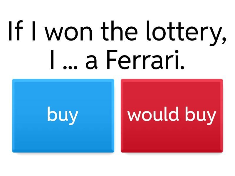 1) If I won the lottery, I ... a Ferrari. a) buy b) would buy 2) If I ... you, I would go to the doctor immediately. a) were b) was 3) What .... you do if you... a wallet in the street? a) will - found b) will - find c) would - found 4) If I ... a car, I ... walk to work everyday.  a) had - wouldn't b) will have - will not  5) I ... forgive Sophie if I were you. a) wouldn't b) won't 6) ... you go to Brenda's party, if you ... busy? a) Would - were b) Will - are c) would - would be 7) If I were you, I ... Kevin the truth. a) will tell b) would tell 8) What would you do if you … a snake? a) see b) saw c) did see 9) If I ... time, I would help you. a) have b) had c) will have 10) If I were you, I ... this hat. It's nice. a) buy b) bought c) would buy 11) What ... you do if you won the lottery? a) would b) will c) did 12) What would you do if you... your leg before a race? a) broke b) break c) would break 13) What would you do if you... the President? a) meet b) met 14) What would you do if you... a motorbike for your birthday? a) have b) had c) will have