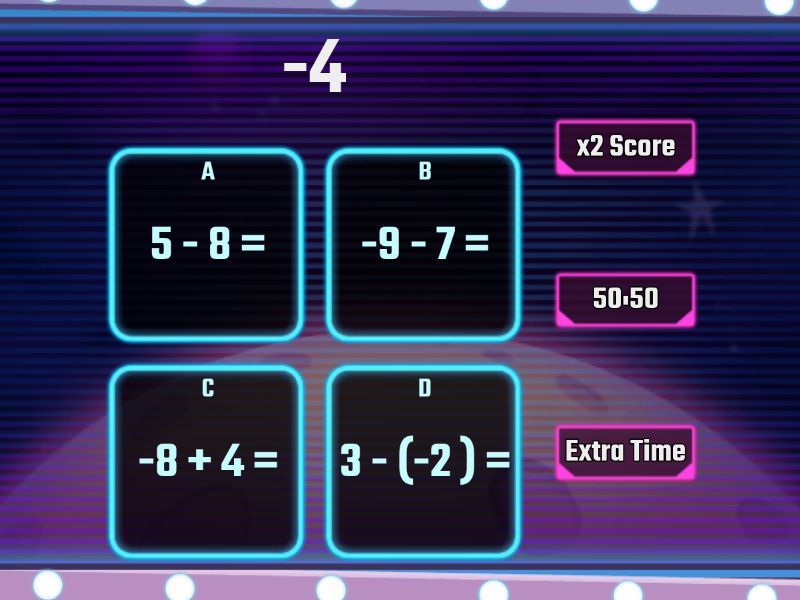 1) -4 a) 5 - 8 =  b) -9 - 7 = c) -8 + 4 = d) 3 - (-2 ) =  2) -3 a) 5 - 8 =  b) -5 - 8 =  c) -3 - 7 =  d) 8 - 4 = 3) -9 a) -6 - 2 =  b) 3 - 8 =  c) -4 - 5 =  d) 5 - 8 =  4) -8 a) 7 - (-4) =  b) -6 - 2 =  c) -5 - 8 =  d) -8 + 2 = 5) -4 a) 3 - -2 =  b) -3 - 1 = c) -6 - 2 =  d) -4 - 5 =  6) 2 a) 9 - 7 = b) -8 + 2 = c) 3 - -2 =  d) 8 - 4 = 7) 11 a) 7 - -4 =  b) 3 - -2 =  c) -8 + 2 = d) -8 - (-9 )=  8) -13 a) -3 - 7 =  b) -5 - 8 =  c) 3 - 4 = d) -4 - 5 =  9) -2 a) -4 - 5 =  b) 9 - 7 = c) 8 - 10 =  d) 3 - (-2) =  10) 5 a) 8 - 10 =  b) 3 - (-2 )=  c) -3 - 7 =  d) -5 - 8 =  11) 1 a) -8 + 2 = b) 9 - 7 = c) -8 - (-9) =  d) 8 - 10 =  12) -10 a) -6 - 2 =  b) -8 + 2 = c) 8 - 10 =  d) -3 - 7 =  13) 9 a) -4 - 5 =  b) 11 + -2 =  c) -6 - 2 =  d) 3 - 8 =  14) -5 a) -9 + 2 = b) -8 - -9 =  c) -3 - 7 =  d) 3 - 8 =  15) -12 a) -5 - 8 =  b) -12 - 0 = c) 3 - -2 =  d) 8 - 4 = 16) -1 a) 8 - 10 =  b) -3 - 1 = c) 3 - 4 = d) -8 - -9 =  17) -6 a) -12 - 0 = b) -8 + 2 = c) -9 + 2 = d) 9 - 7 = 18) -7 a) -4 - 5 =  b) -8 + 2 = c) 3 - 8 =  d) -9 + 2 = 19) 6 a) 3 - 4 = b) 8 - 10 =  c) -5 - 8 =  d) -4 + 10 = 20) 5 - 8 a) -3 b) 3 c) -13 d) 13
