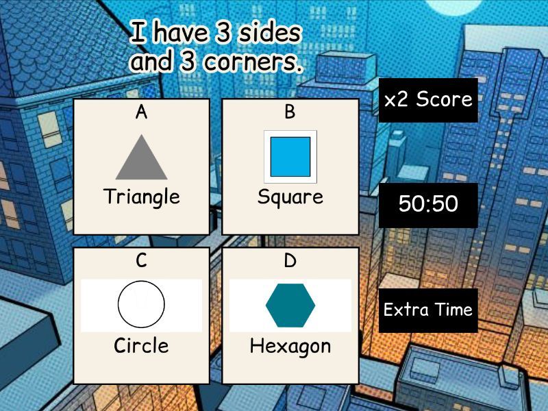 1) I have 3 sides and 3 corners. a) Triangle b) Square c) Circle d) Hexagon 2) I have 4 sides of all the same length and 4 corners. a) Rectangle b) Triangle c) Hexagon d) Square 3) I have no corners and no sides. a) Hexagon b) Circle c) Square d) Triangle 4) I have 2 long sides and 4 equal corners  a) Triangle b) Circle c) Square d) Rectangle 5) I have 6 sides and 6 corners. a) Circle b) Triangle c) Rectangle d) Hexagon 6) I have 3 edges and 3 vertices a) Triangle b) Diamond c) Star d) Oval 7) What is a vertex? a) A corner point b) A flat surface c) A straight line d) A curved edge 8) How many edges does a hexagaon have? a) 12 b) 8 c) 6 d) 10 9) What shape has 4 sides? a) Square b) Triangle c) Pentagon d) Circle 10) How many corners does a triangle have? a) 3 b) 4 c) 5 d) 6 11) How many vertices does a square have? a) 4 b) 3 c) 5 d) 6 12) Which shape has no corners? a) Circle b) Rectangle c) Hexagon d) Triangle 13) How many sides does a hexagon have? a) 6 b) 5 c) 4 d) 7