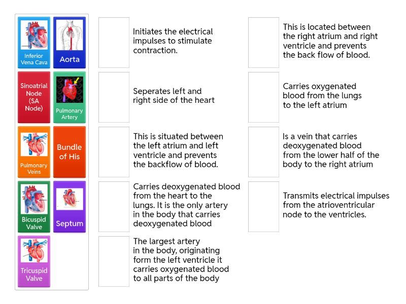 Left Atrium - This chamber receives oxygenated blood from the body before passing it onto the left ventricle, Left Ventricle - This chamber pumps blood into the aorta which takes the oxygenated blood around the body., Right Ventricle - This chamber pumps blood into the pulmonary artery, before directing the blood to the lungs, Tricuspid Valve - This is located between the right atrium and right ventricle and prevents the back flow of blood., Aortic/semilunar valve - This valve lies between the left ventricle and the aorta preventing the back flow of blood., Pulmonary Veins - Carries oxygenated blood from the lungs to the left atrium, Superior Vena Cava - Is a large but short vein that carries deoxygenated blood from the upper half of the body to the right atrium, Aorta - The largest artery in the body, originating form the left ventricle it carries oxygenated blood to all parts of the body, Bicuspid Valve - This is situated between the left atrium and left ventricle and prevents the backflow of blood., Septum - Seperates left and right side of the heart, Pulmonary Artery - Carries deoxygenated blood from the heart to the lungs. It is the only artery in the body that carries deoxygenated blood, Inferior Vena Cava - Is a vein that carries deoxygenated blood from the lower half of the body to the right atrium, Right Atrium - This chamber receives deoxygenated blood from the body before delivering it to the right ventricle, Sinoatrial Node (SA Node) - Initiates the electrical impulses to stimulate contraction., Atrioventricular Node (AV Node) - Slows down the electrical current before it is passed to the ventricles., Bundle of His - Transmits electrical impulses from the atrioventricular node to the ventricles., Purkinje Fibres - Transmit electrical signals rapidly, which allows the ventricles to contract in a coordinated manner.,