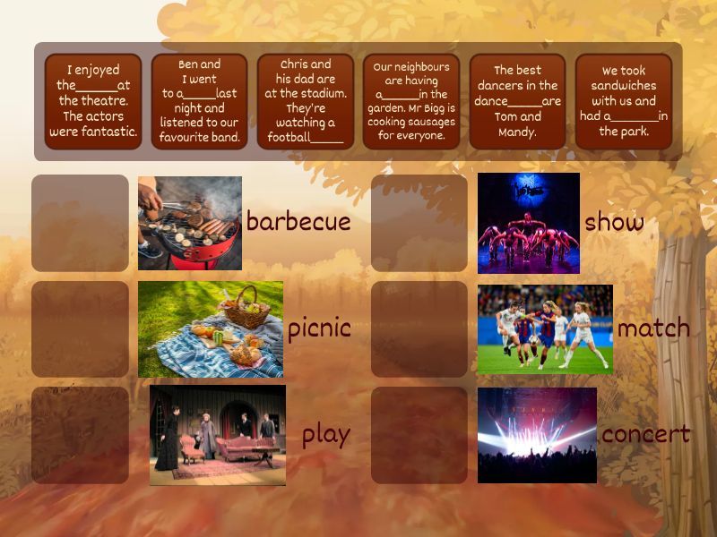 They’re at the cinema and they’re watching a_____ - film, Hannah’s friends went to her house for a______ They had fun all night . - sleepover, Ben and I went to a_____last night and listened to our favourite band. - concert, I enjoyed the______at the theatre. The actors were fantastic. - play, Our neighbours are having a______in the garden. Mr Bigg is cooking sausages for everyone. - barbecue, Dora is twelve years old today. There are a lot of people at her______ - birthday party, The best dancers in the dance_____are Tom and Mandy. - show, Chris and his dad are at the stadium. They’re watching a football_____ - match, Ewa wore a beautiful costume to the______party. - fancy dress, My sister took part in a____on TV. People loved her! - talent competition, We took sandwiches with us and had a_______in the park. - picnic,