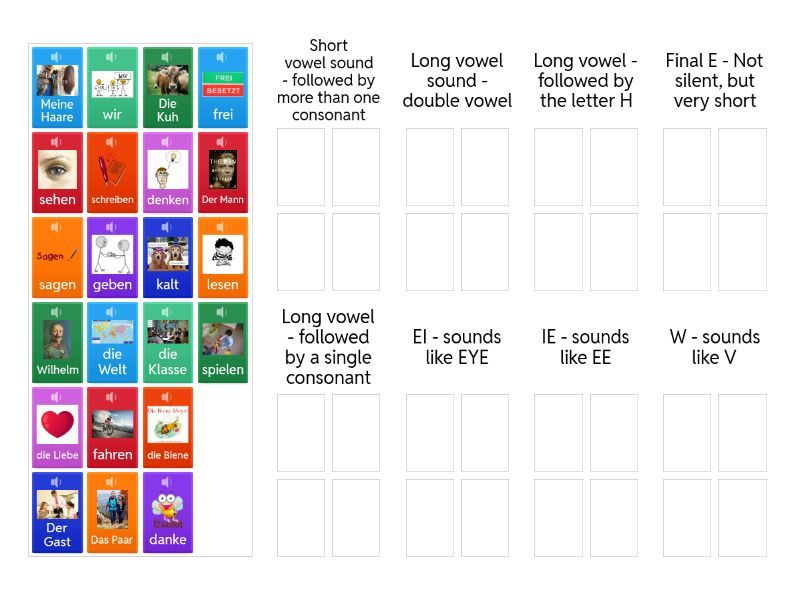 Short vowel sound - followed by more than one consonant: Der Mann, Der Gast, kalt, denken, Long vowel sound - double vowel: Das Paar, Meine Haare, Long vowel - followed by the letter H: fahren, sehen, Die Kuh, Final E - Not silent, but very short: danke, die Klasse, Long vowel - followed by a single consonant: sagen, lesen, geben, EI - sounds like EYE: frei, schreiben, IE - sounds like EE: die Liebe, die Biene, spielen, W - sounds like V: wir, Wilhelm, die Welt,