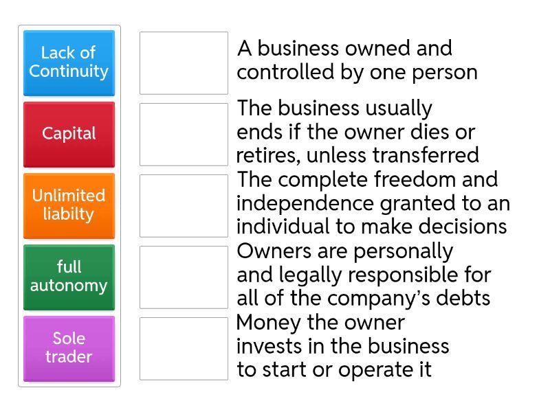 Unlimited liabilty - Owners are personally and legally responsible for all of the company’s debts, full autonomy - The complete freedom and independence granted to an individual to make decisions, Sole trader - A business owned and controlled by one person, Capital - Money the owner invests in the business to start or operate it, Lack of Continuity - The business usually ends if the owner dies or retires, unless transferred,