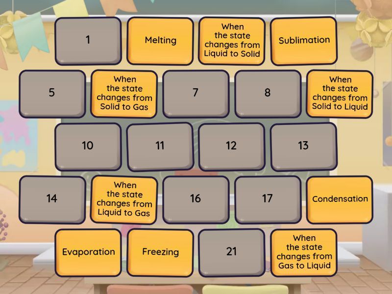 Melting - When the state changes from Solid to Liquid, Freezing - When the state changes from Liquid to Solid, Evaporation - When the state changes from Liquid to Gas, Condensation - When the state changes from Gas to Liquid, Sublimation - When the state changes from Solid to Gas, Deposition - When the state changes from Gas to Solid, Freezing Point - Temperature where objects transfer from Liquid to Solid, Melting Point - Temperature where objects transfer from Solid to Liquid, Boiling Point - Temperature where objects transfer from Liquid to Gas, 100 Degrees Celsius - Boiling Point of Water, 0 Degrees Celsius - Melting and Freezing Point of Water,