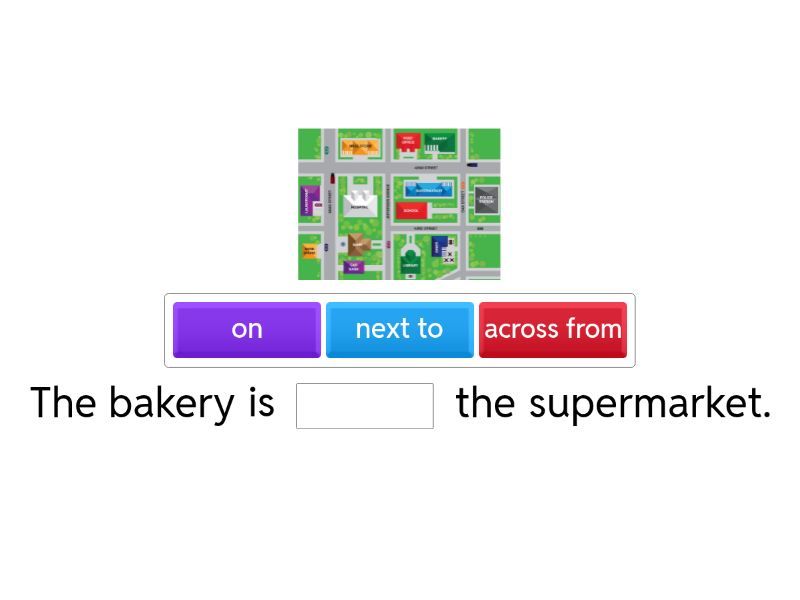 The shoe store is ____ Main Street. The car wash is ____ the bank. The police station is ____ Oak Street. The post office is next to the ____. The drug store is ____ the hospital. The diner is on the corner of ____. The bakery is ____ the supermarket. The supermarket is on ____. The post office is ____ the drug store and the bakery. The post office is on the corner of ____. The hospital is ____ the Main Street and Jefferson Avenue.