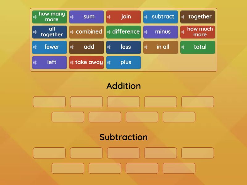 Addition: in all, total, combined, all together, sum, together, join, plus, add, Subtraction: difference, how many more, how much more, fewer, less, left, take away, minus, subtract,