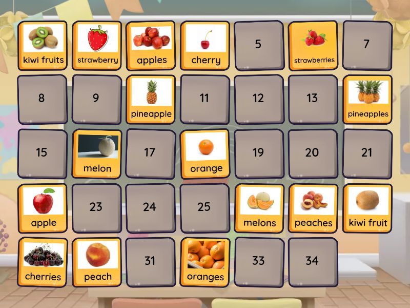 apple - apples, melon - melons, peach - peaches, pineapple - pineapples, cherry - cherries, strawberry - strawberries, orange - oranges, kiwi fruit - kiwi fruits, onion - onions, mushroom - mushrooms, green pepper - green peppers, tomato - tomatoes, cabbage - cabbages, carrot - carrots, corn - corn, cucumber - cucumbers, potato - potatoes,