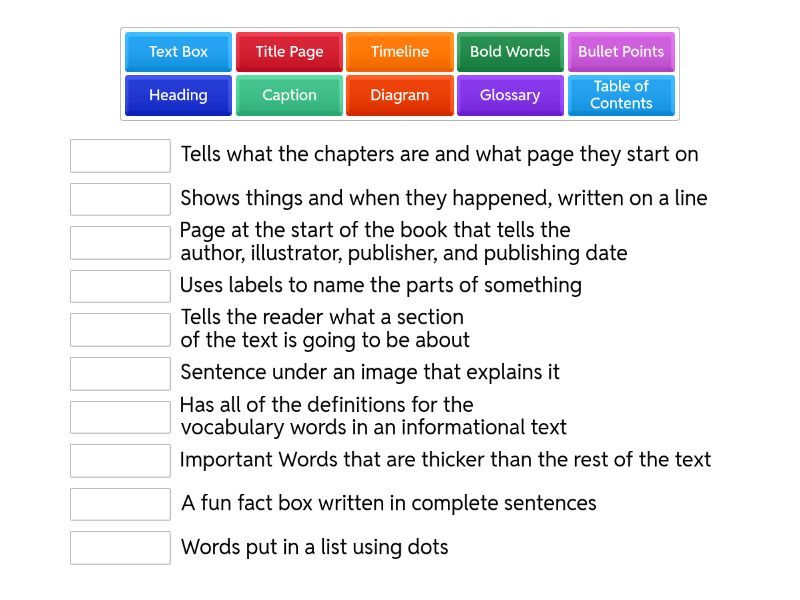 Heading - Tells the reader what a section of the text is going to be about, Bold Words - Important Words that are thicker than the rest of the text, Bullet Points - Words put in a list using dots, Text Box - A fun fact box written in complete sentences, Caption - Sentence under an image that explains it, Title Page - Page at the start of the book that tells the author, illustrator, publisher, and publishing date, Table of Contents - Tells what the chapters are and what page they start on, Glossary - Has all of the definitions for the vocabulary words in an informational text, Diagram - Uses labels to name the parts of something, Timeline - Shows things and when they happened, written on a line,