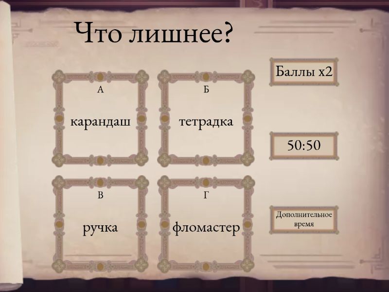 1) Что лишнее? a) карандаш b) тетрадка c) ручка d) фломастер 2) Что лишнее? a) тигр b) леопард c) медведь d) пантера 3) Что лишнее? a) осина b) сосна c) лиственница d) яблоня 4) Что лишнее? a) подснежник b) василек c) колокольчик d) роза 5) Что лишнее? a) гусь b) утка c) голубь d) курица 6) Что лишнее? a) пшеница b) картофель c) рожь d) овес 7) Что лишнее? a) компот b) лимонад c) чай d) кисель 8) Что лишнее? a) блокнот b) чернила c) альбом d) магазин