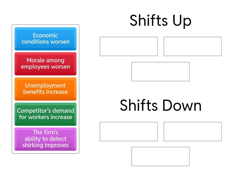 Shifts Up: Competitor's demand for workers increase, Unemployment benefits increase, Morale among employees worsen, Shifts Down: The firm's ability to detect shirking improves, Economic conditions worsen,