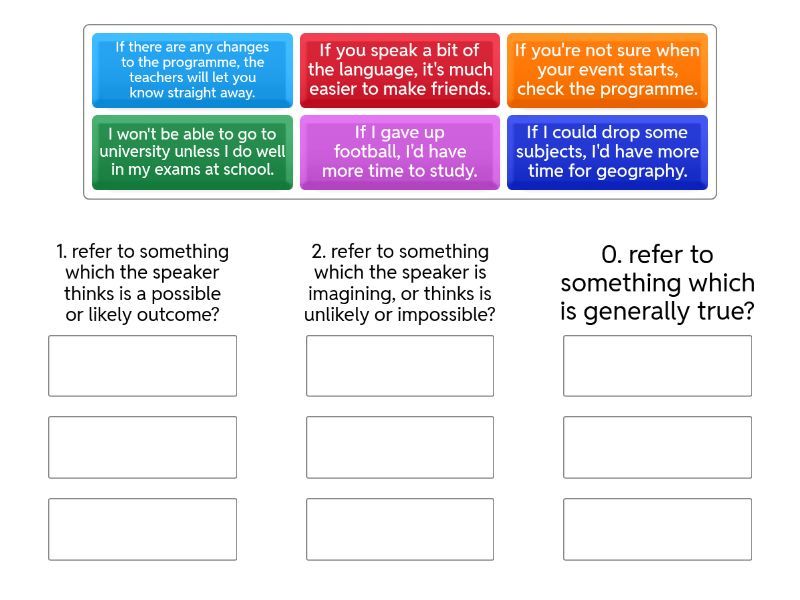 1. refer to something which the speaker thinks is a possible or likely outcome?: If you're not sure when your event starts, check the programme., If there are any changes to the programme, the teachers will let you know straight away., I won't be able to go to university unless I do well in my exams at school., 2. refer to something which the speaker is imagining, or thinks is unlikely or impossible?: If I gave up football, I'd have more time to study., If I could drop some subjects, I'd have more time for geography., 0. refer to something which is generally true?: If you speak a bit of the language, it's much easier to make friends.,