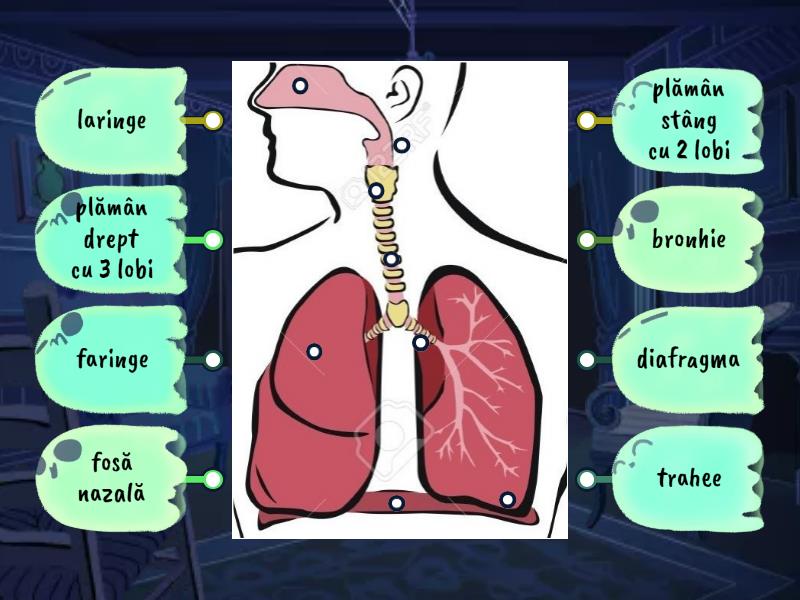fosă nazală, faringe, laringe, trahee, bronhie, plămân drept cu 3 lobi, diafragma, plămân stâng cu 2 lobi.