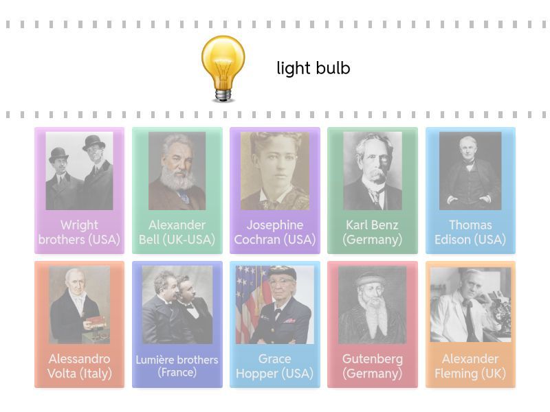 Thomas Edison (USA) - light bulb, Gutenberg (Germany) - printing press, Alexander Fleming (UK) - penicillin, Karl Benz (Germany) - car, Wright brothers (USA) - airplane, Lumière brothers (France) - cinema, Alexander Bell (UK-USA) - telephone, Alessandro Volta (Italy) - battery, Josephine Cochran (USA) - dishwasher, Grace Hopper (USA) - computer programming,