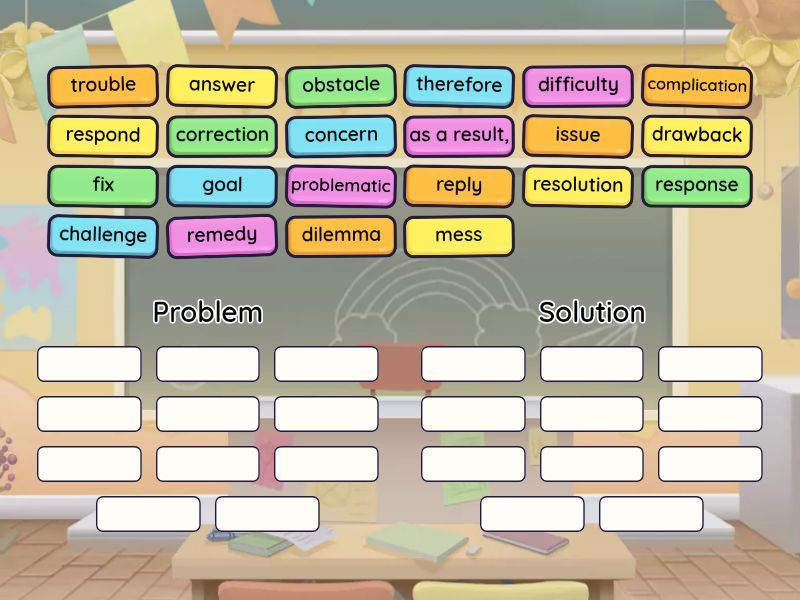 Problem: obstacle, issue, complication, dilemma, problematic, trouble, drawback, concern, mess, difficulty, challenge, Solution: remedy, resolution, fix, as a result,, therefore, answer, reply, response, respond, goal, correction,